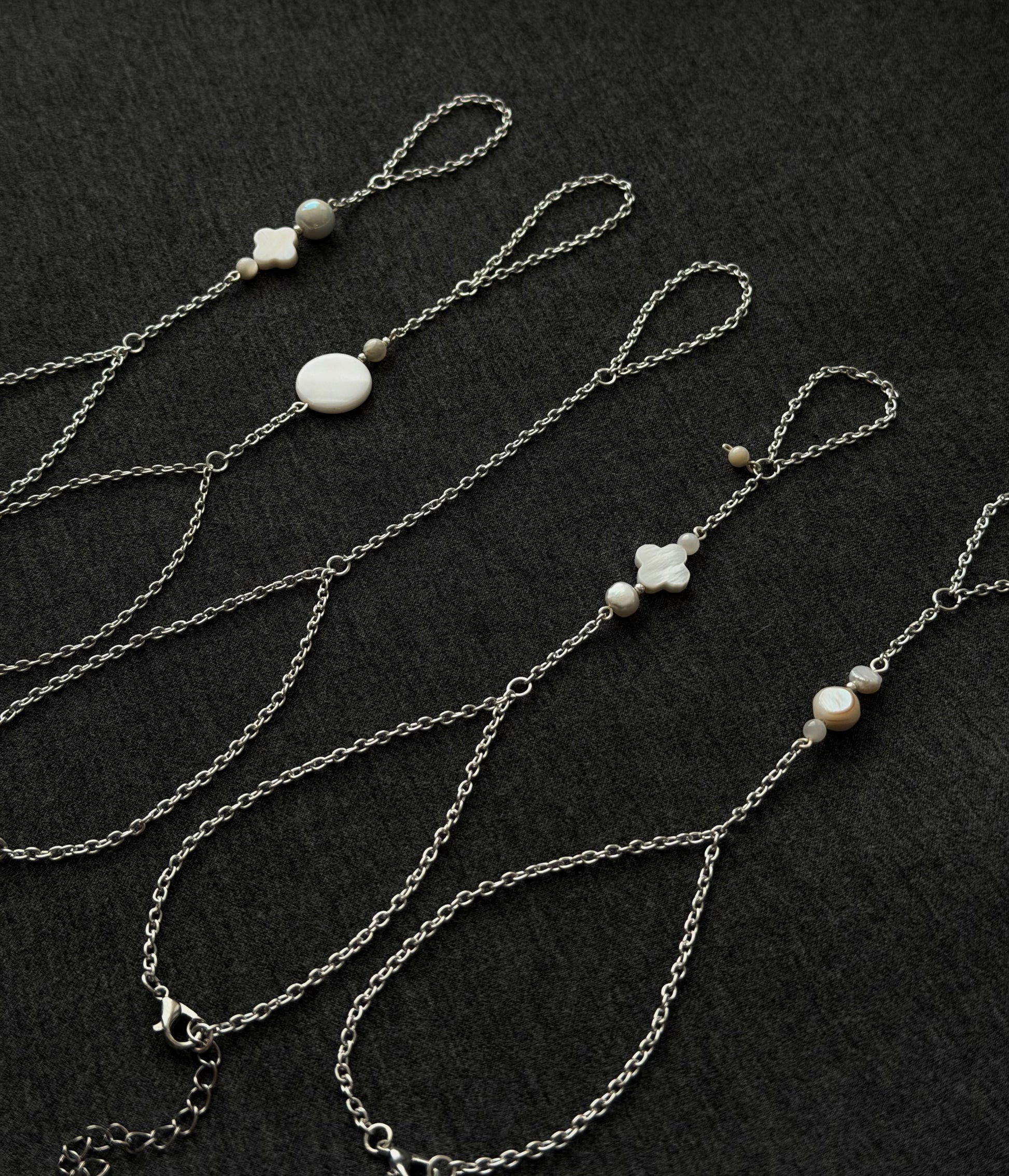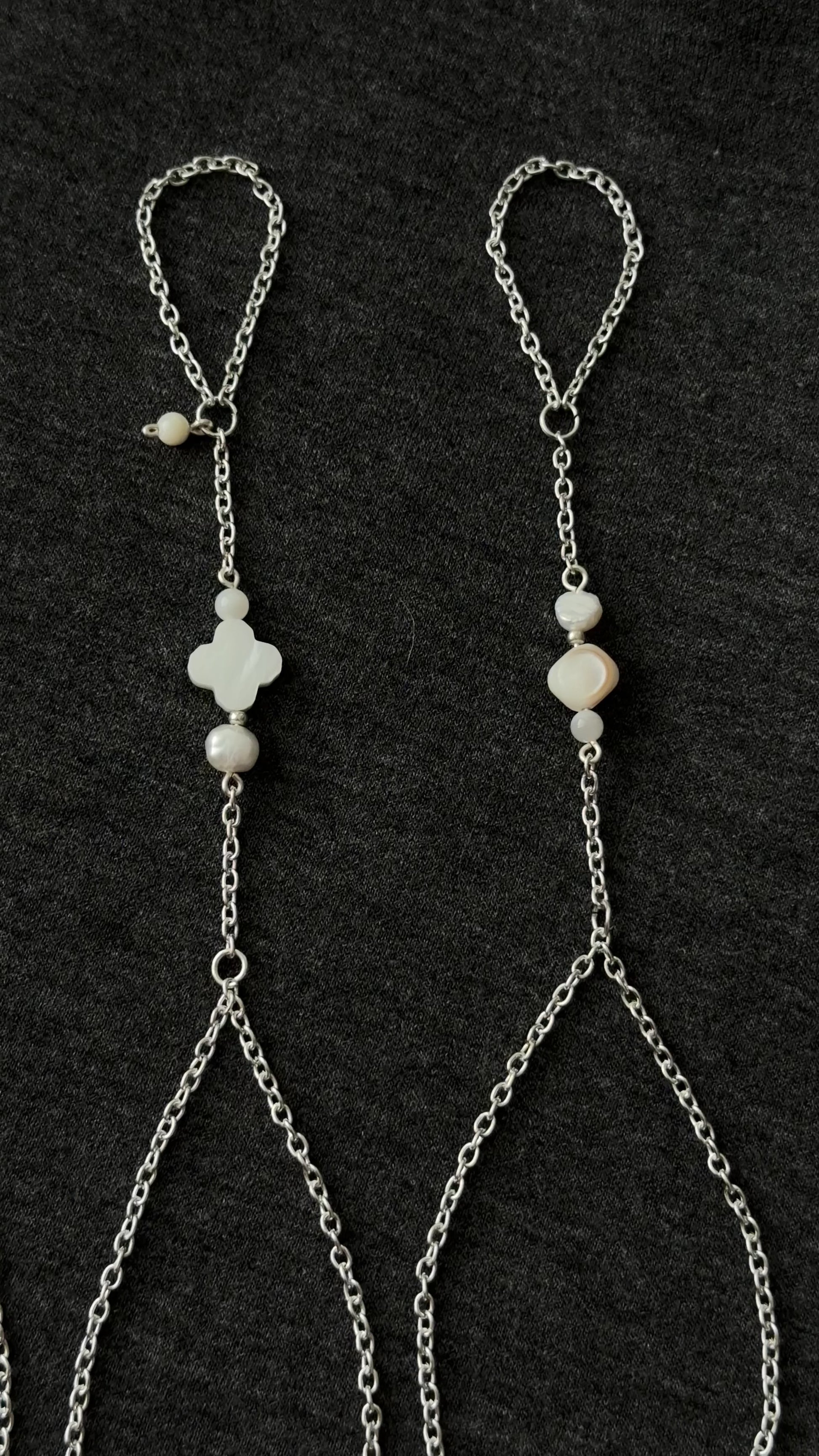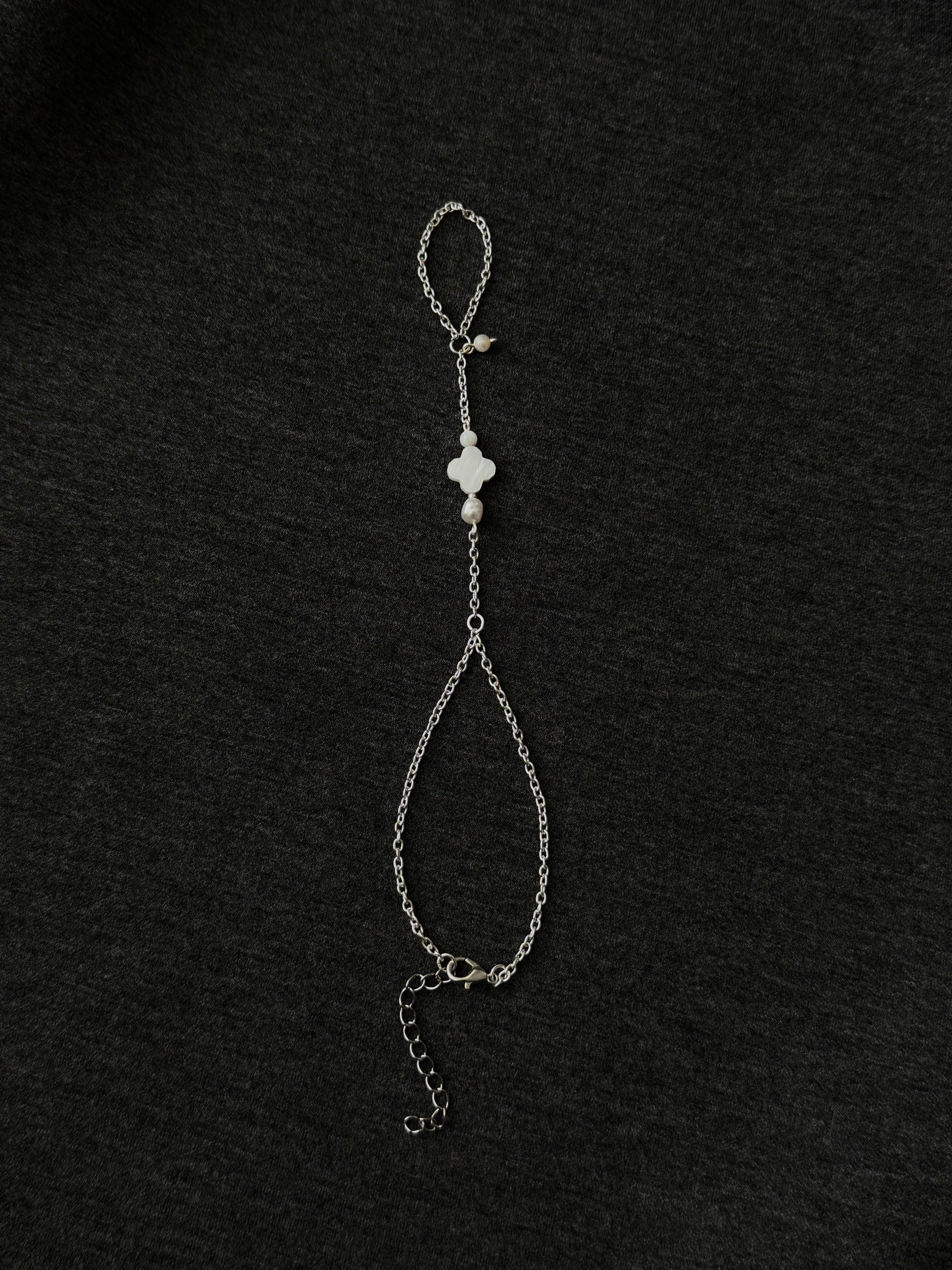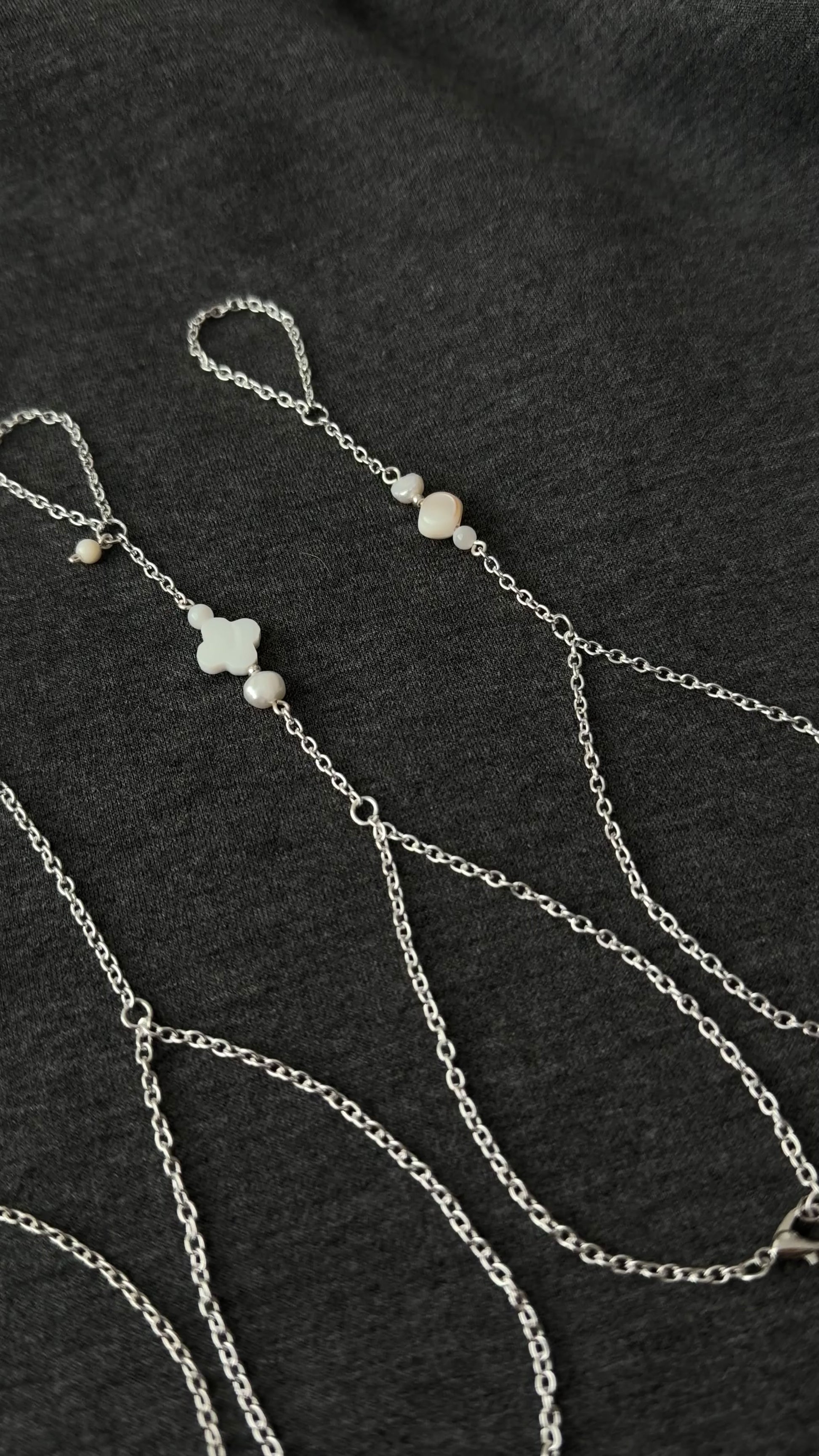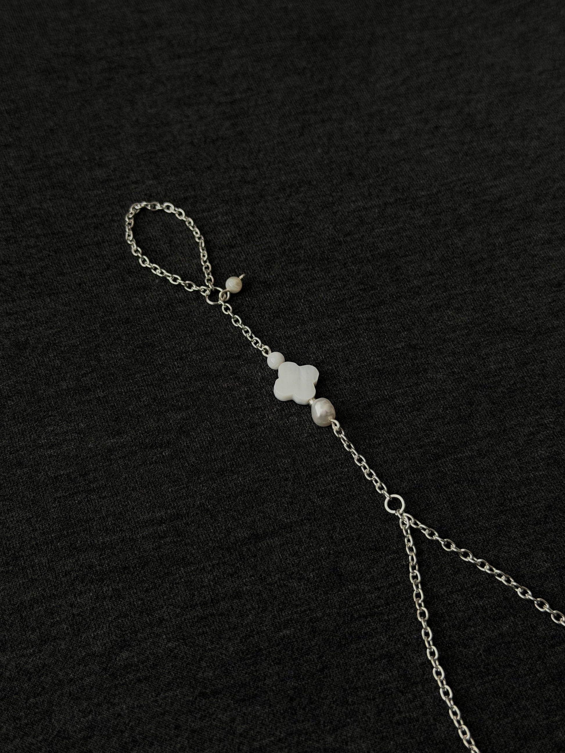 This handmade hand chain features genuine freshwater pearls and delicate mother of pearl accents, finished with a refined clover charm that adds dimension and elegance. The vertical pearl detailing creates a flattering, elongating effect across the hand, while the fine chain keeps the look light and graceful.