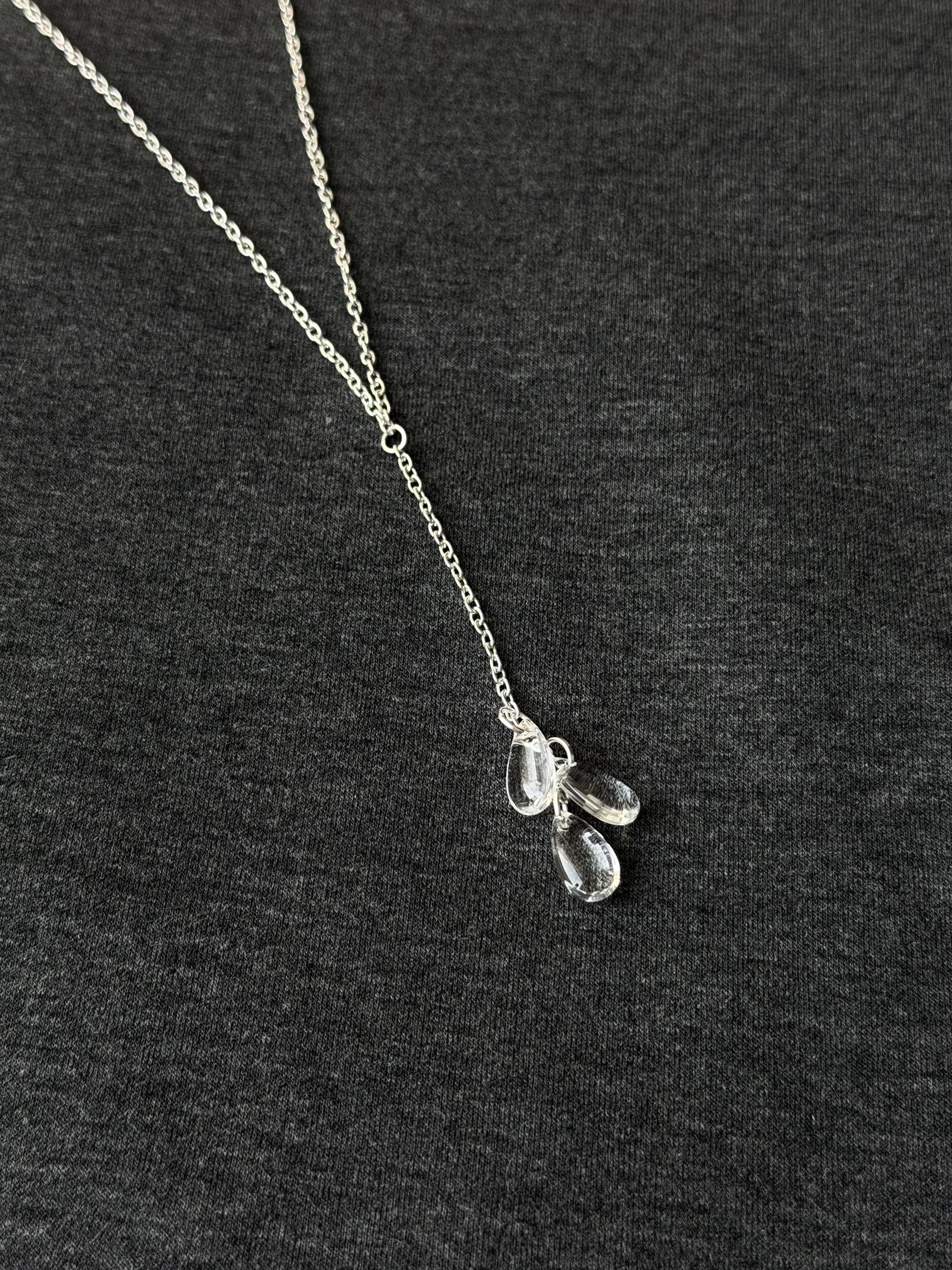 The Valora Necklace features a luminous glass drop suspended from a refined chain, catching the light with every movement. Clean and sculptural, it creates a subtle focal point that feels both modern and timeless.